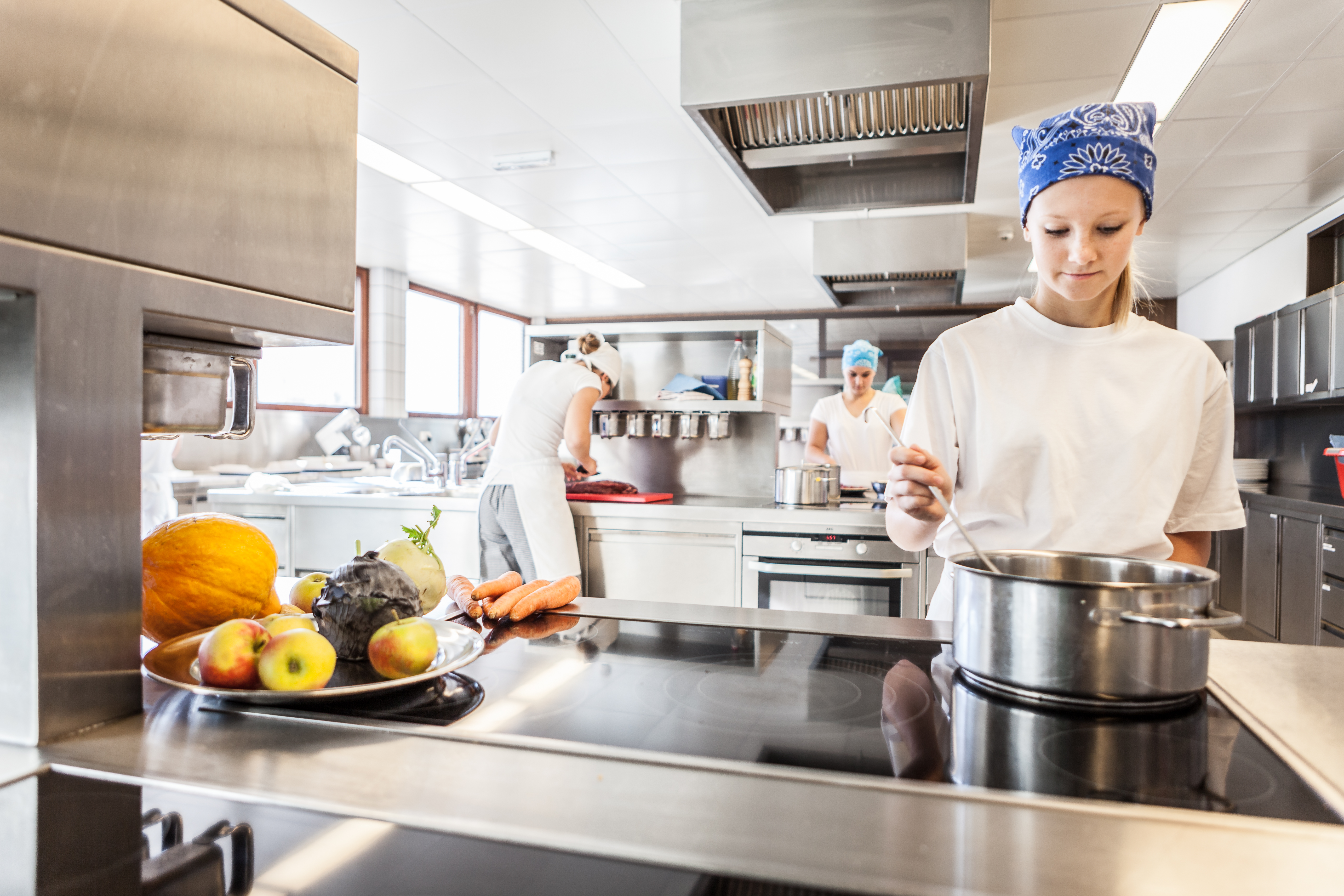 Das Arbeiten in der Betriebsküche ist für die meisten Schülerinnen eine ganz neue Erfahrung. Beim Kochen für über 300 Personen soll rationelles Arbeiten gelernt werden.